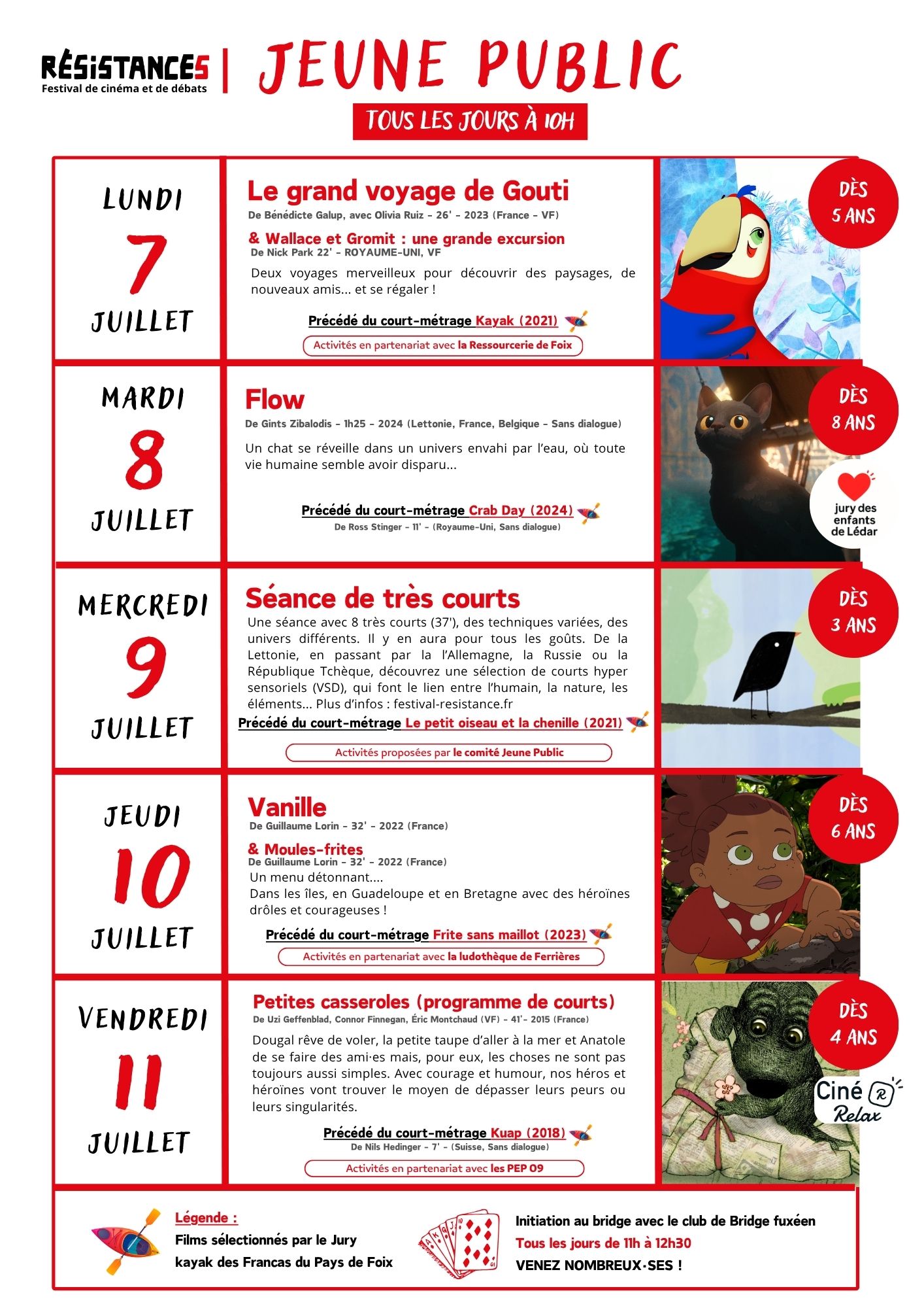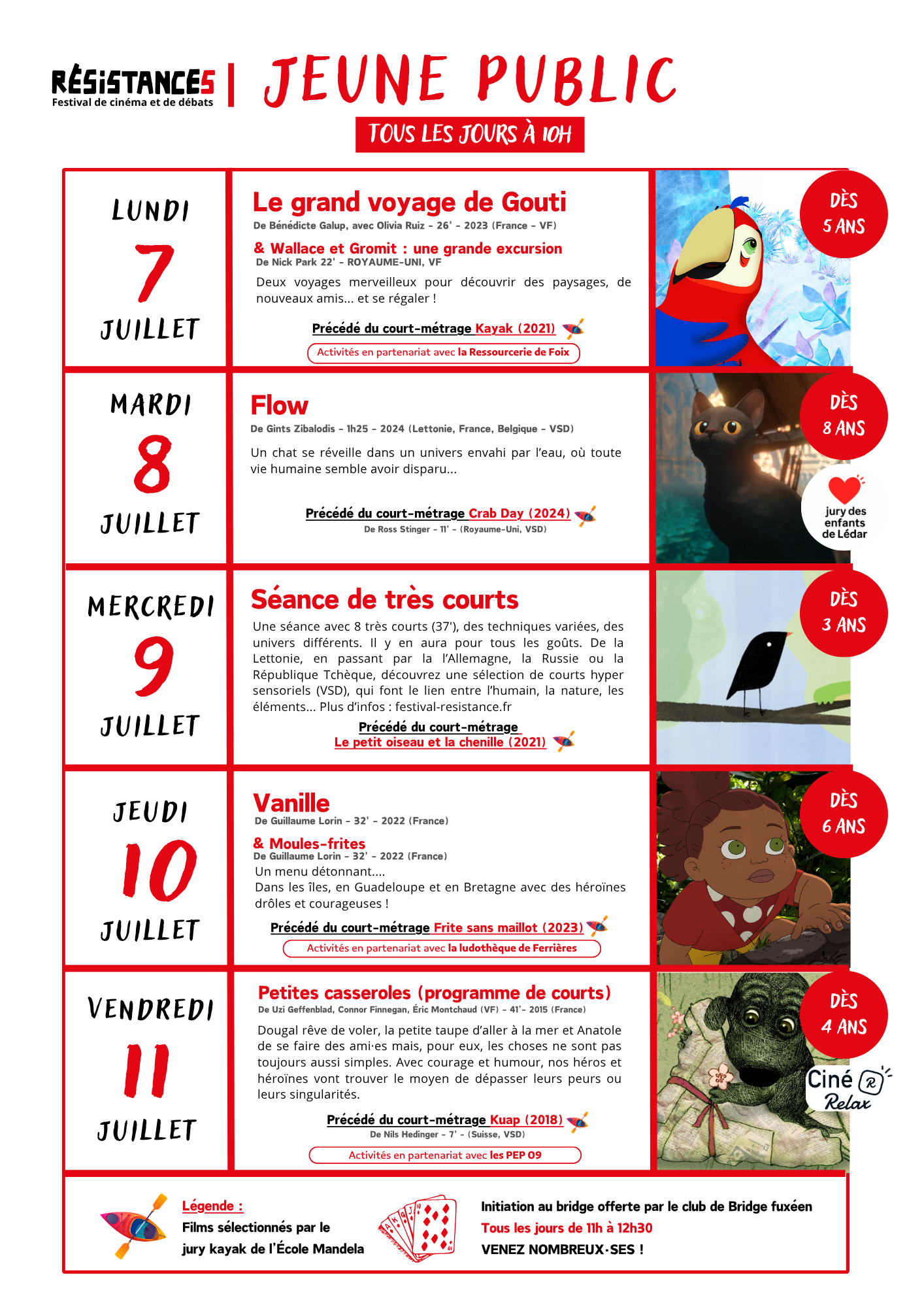 Du lundi au vendredi, à 10h, les enfants pourront assister à une projection suivie d’une activité en rapport avec la thématique.